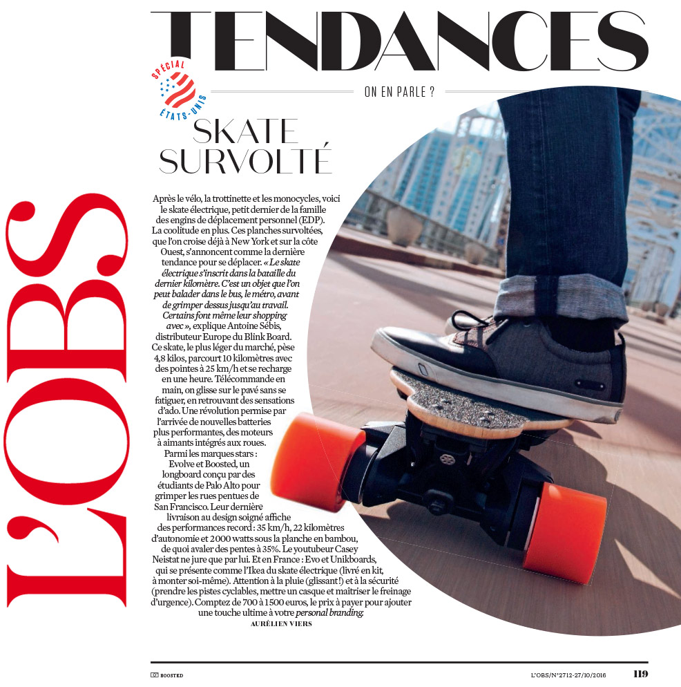Dans un article tendance consacré à la micro-mobilité, L’OBS cite Evo-Spirit parmi les marques pionnières du skate électrique.